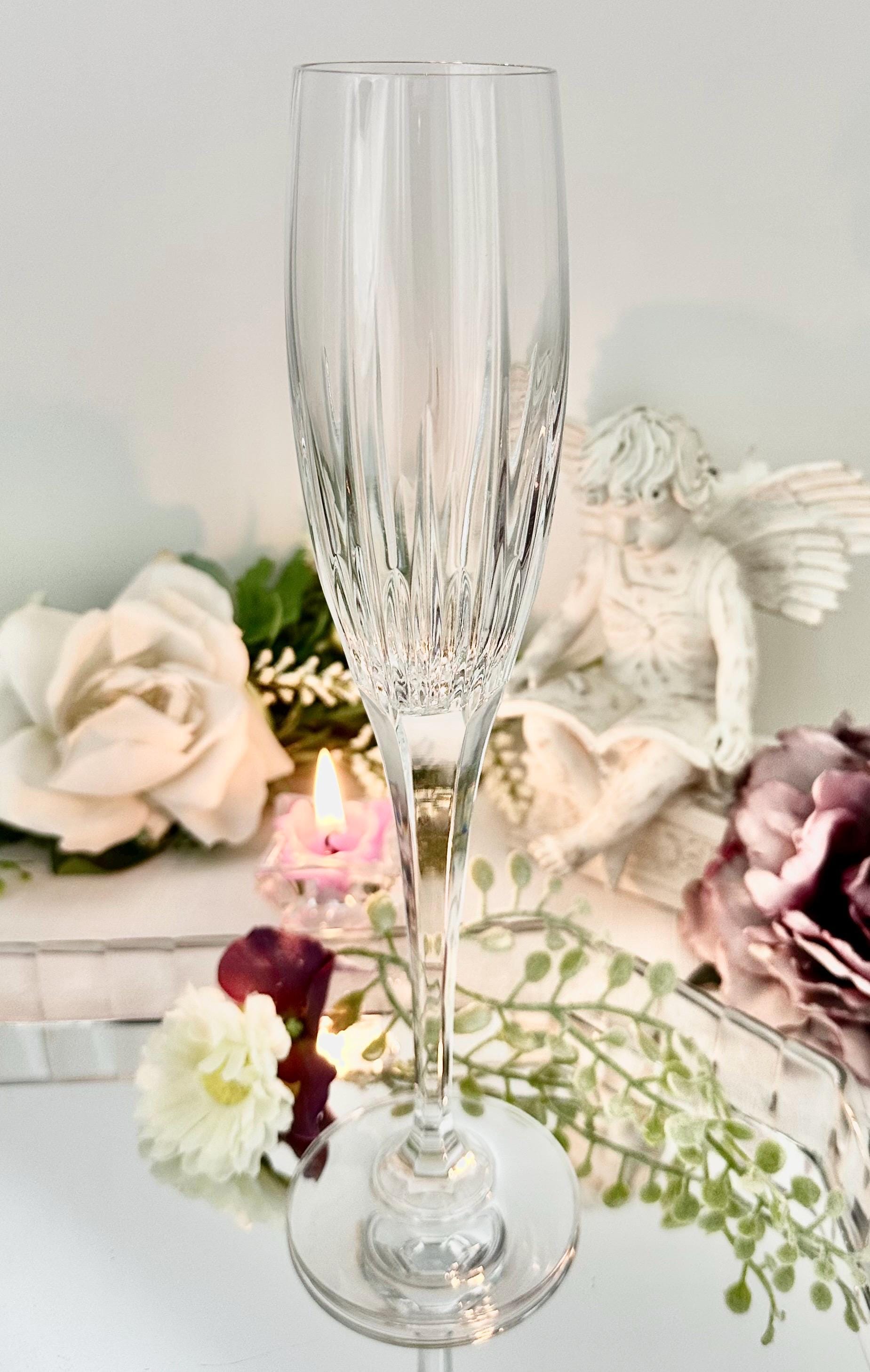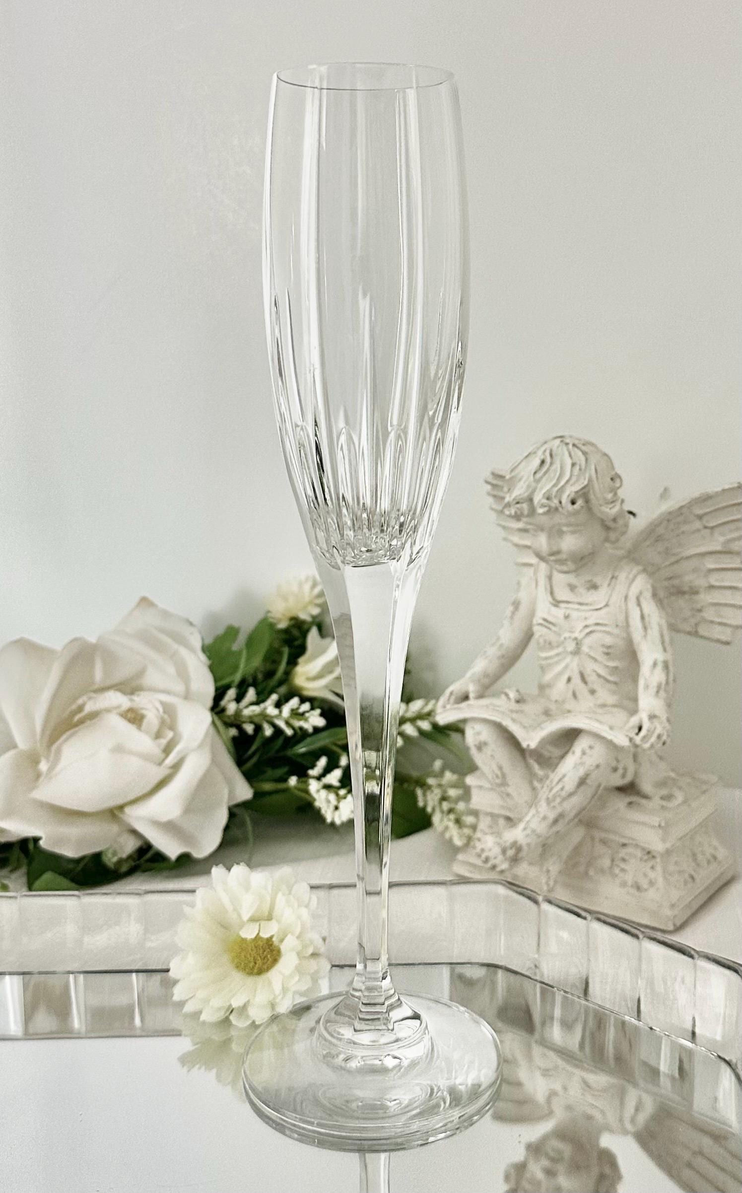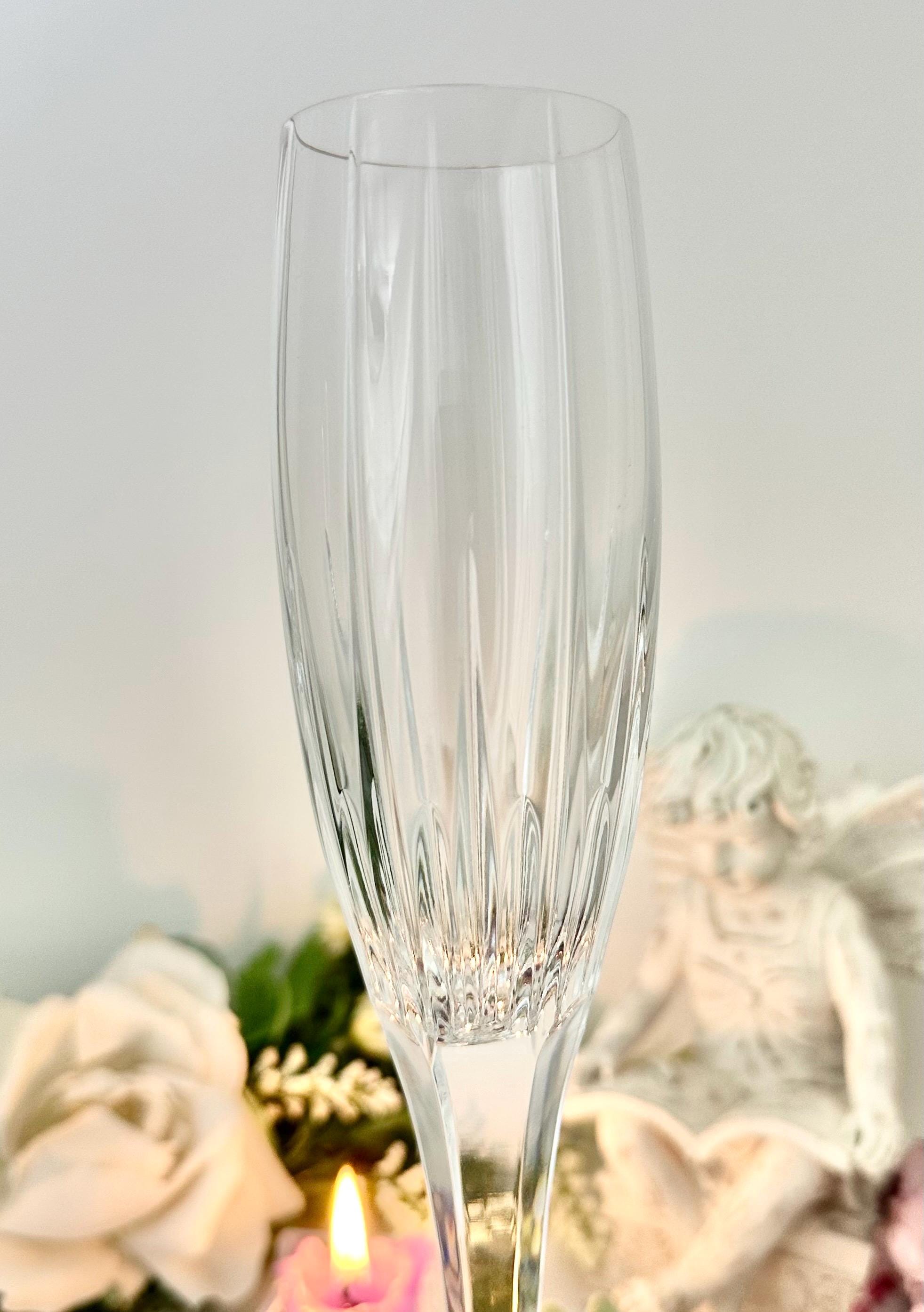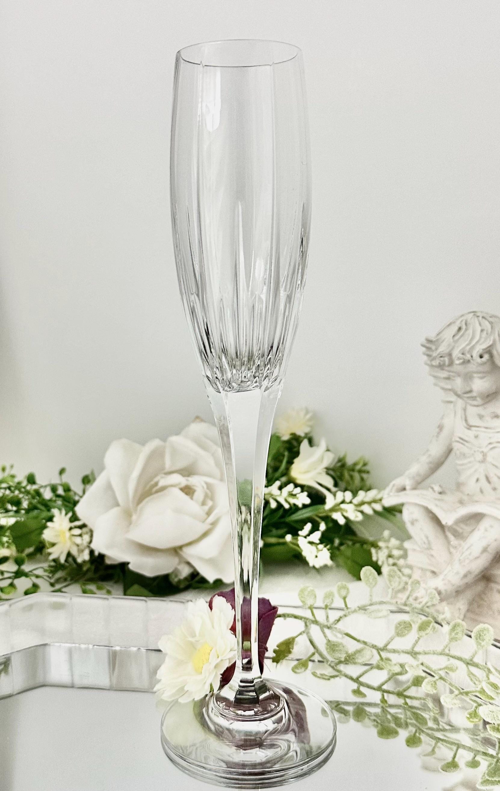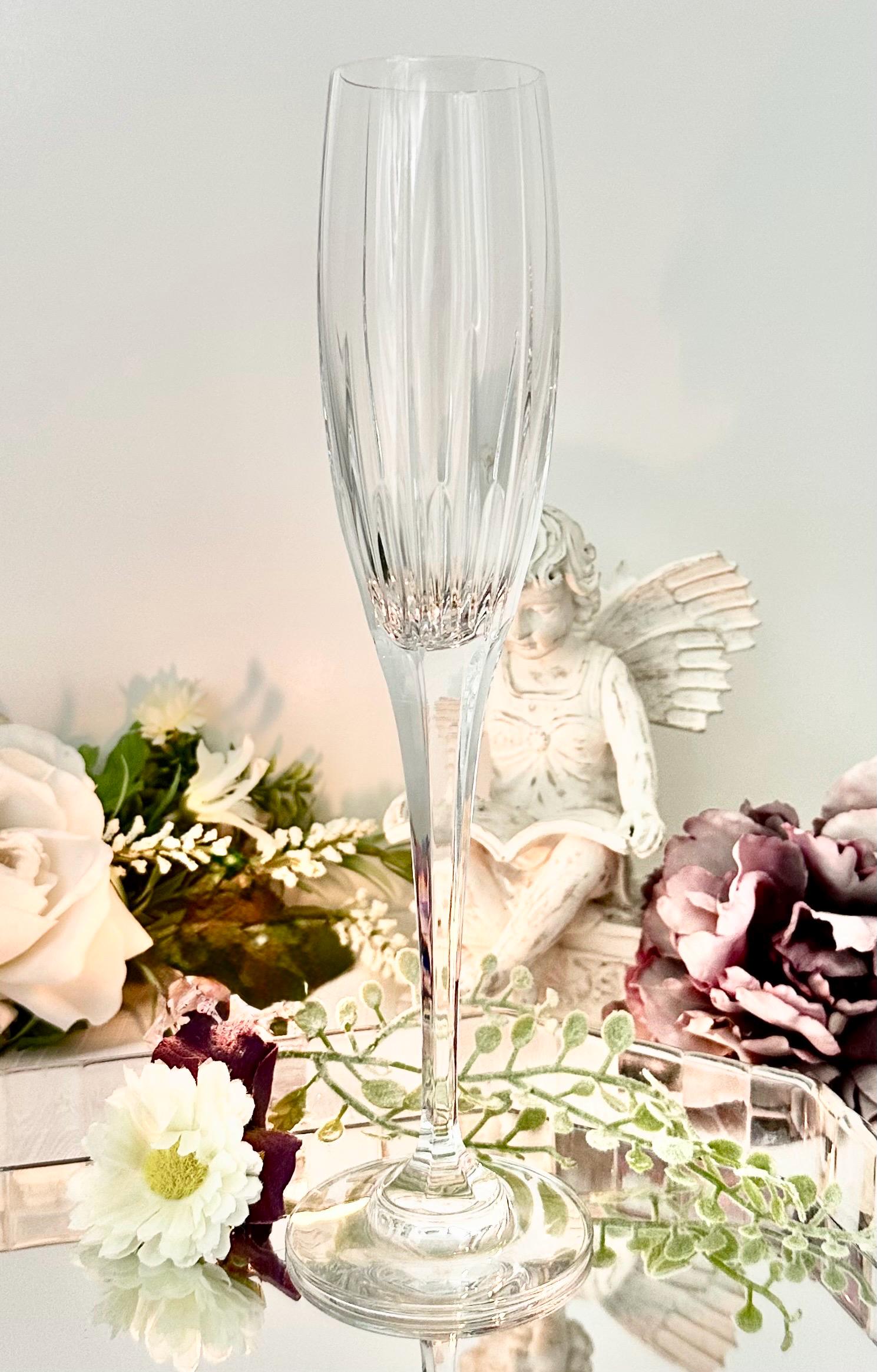 This is for 1 wonderful vintage Mikasa Crystal Champagne Flute in the Arctic Lights pattern. The Mikasa glass has deep vertical cuts on the bowl that lead to a multisided stem. This shape and pattern make for a beautiful pair of toasting statement glasses.