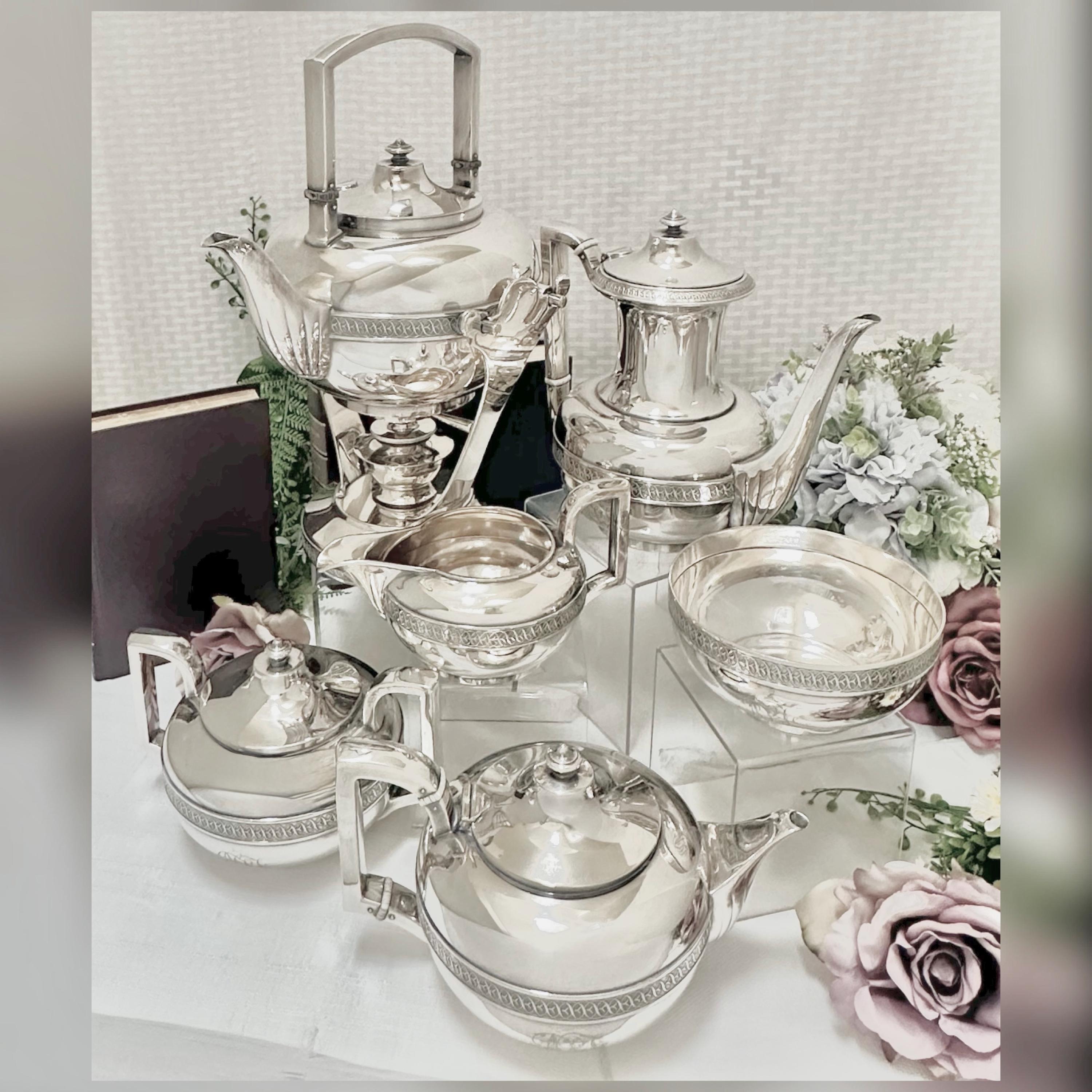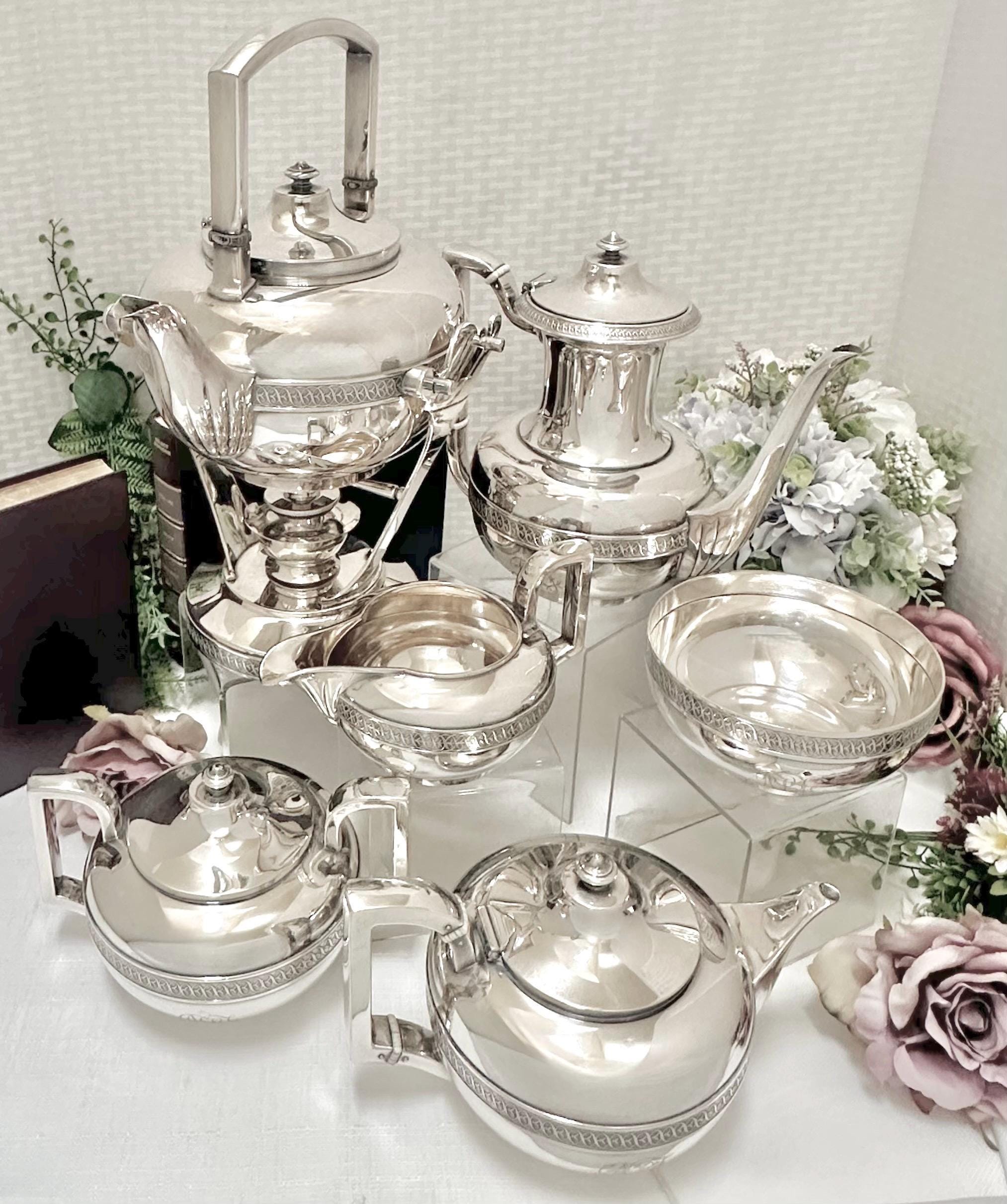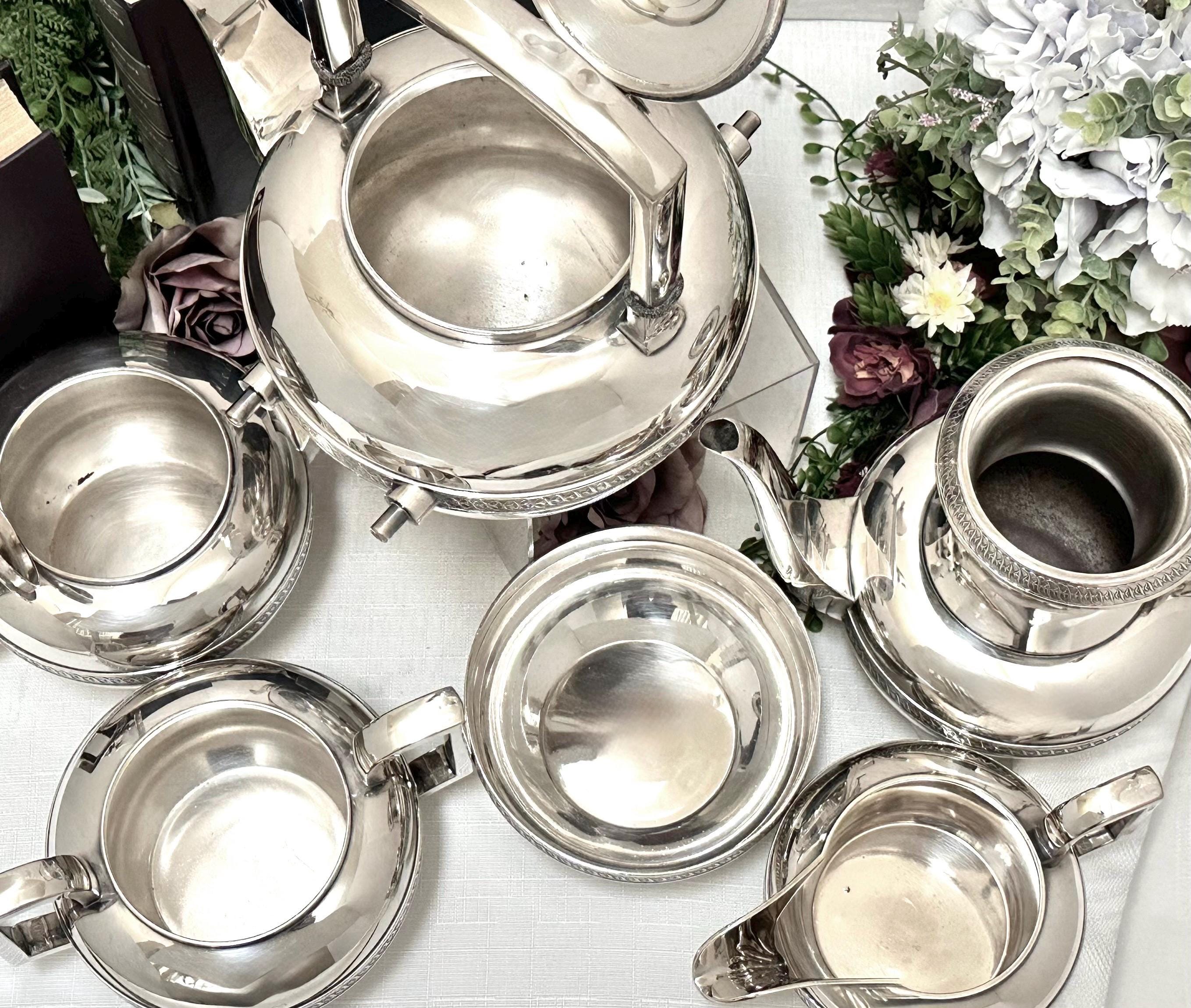 This beautiful Silver Plated rare set includes a tilting teapot on stand with burner, making serving tea a unique and elegant experience. Crafted in the United States during the late 19th century to the early 20th century. All pieces are monogrammed on the bottom half of the items and I am unaware of the initials but with the design it adds some interest to the items!