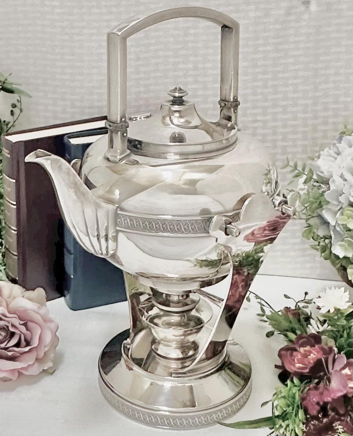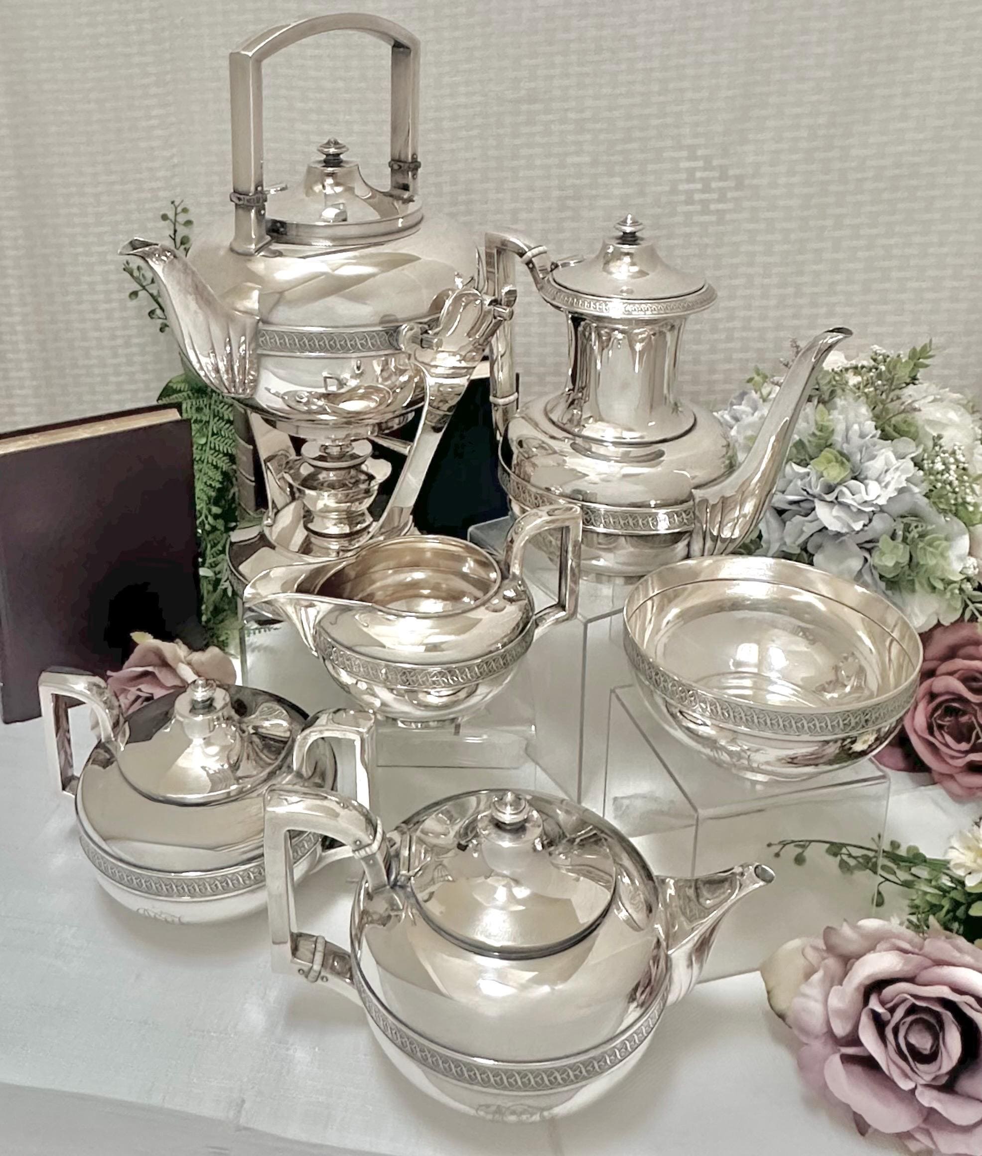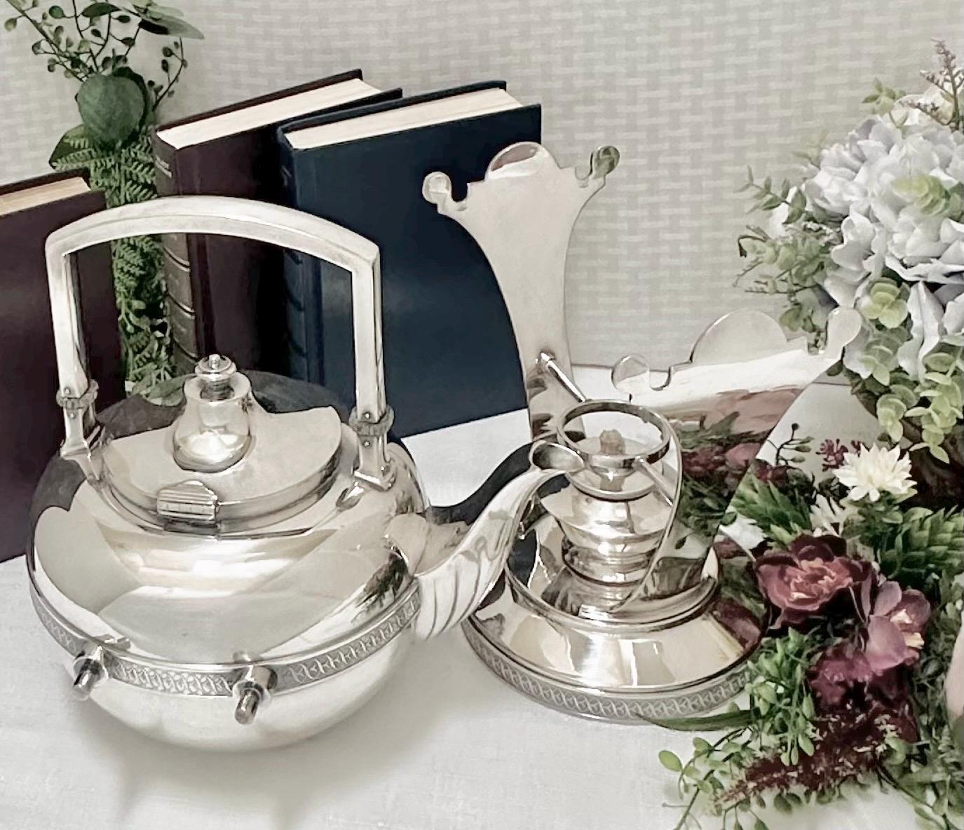 This beautiful Silver Plated rare set includes a tilting teapot on stand with burner, making serving tea a unique and elegant experience. Crafted in the United States during the late 19th century to the early 20th century. All pieces are monogrammed on the bottom half of the items and I am unaware of the initials but with the design it adds some interest to the items!