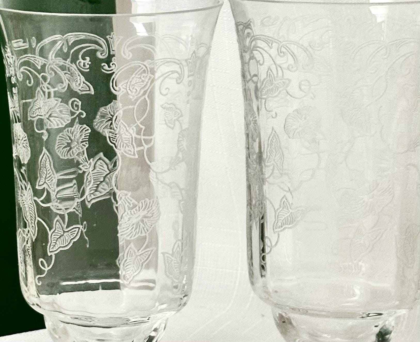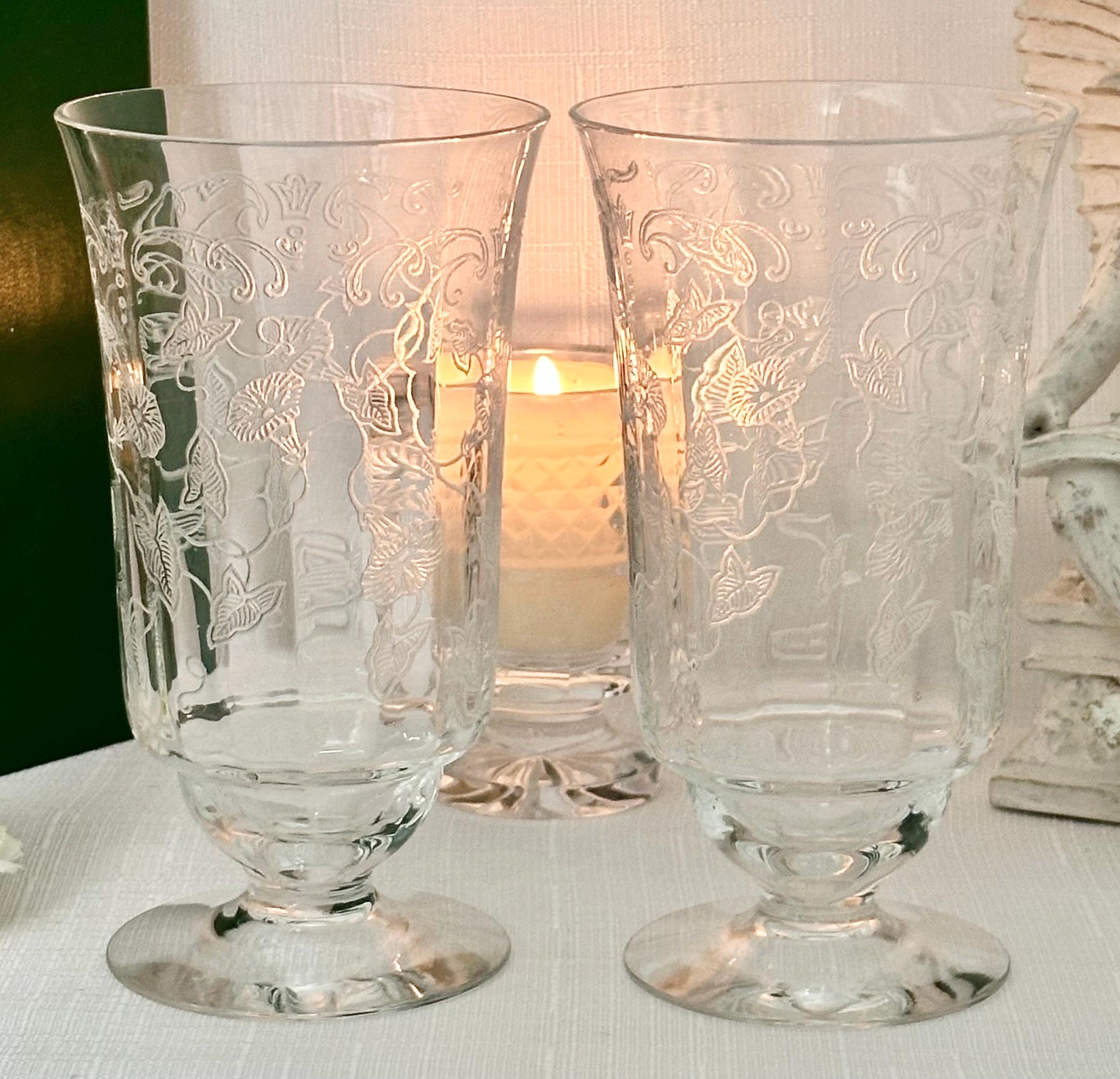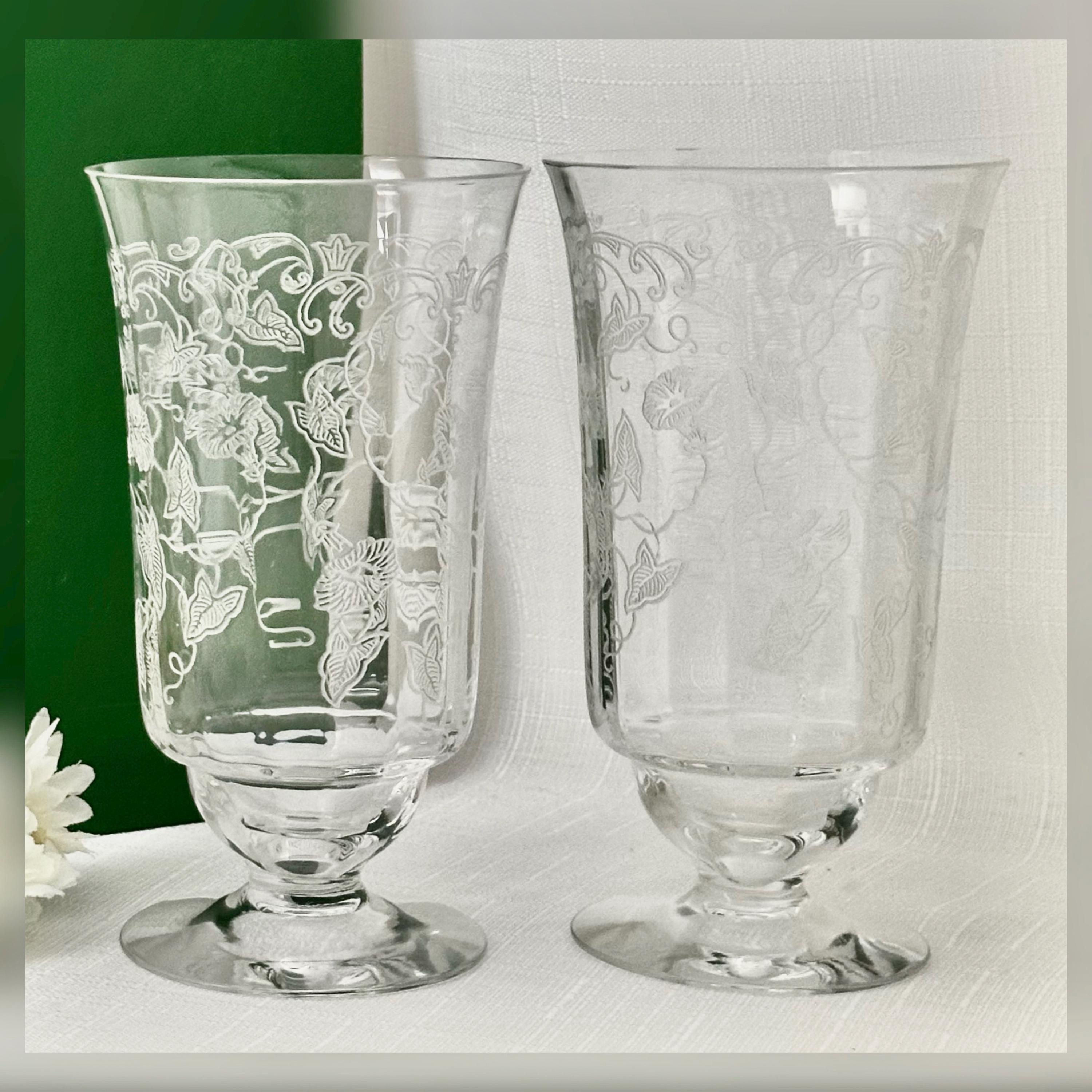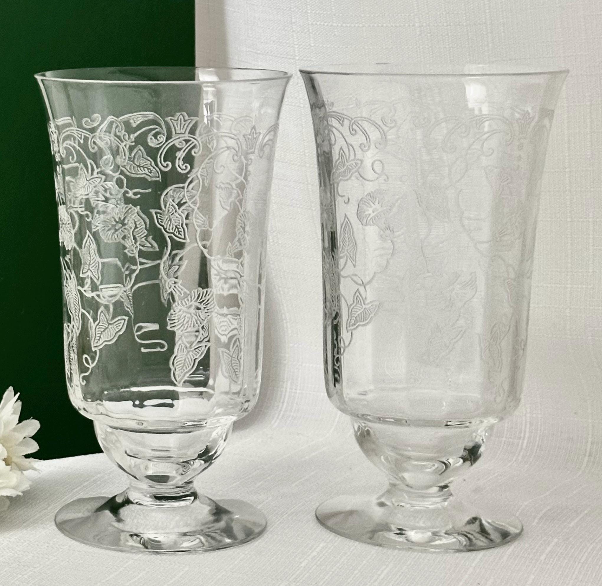 This is for a pair of Fostoria Morning Glory Ice Tea Glasses. These are a vintage pair of etched round drinking glasses perfect for all occasions. Made of clear glass, each glass features a floral design on the bowl with the etched pattern #313.