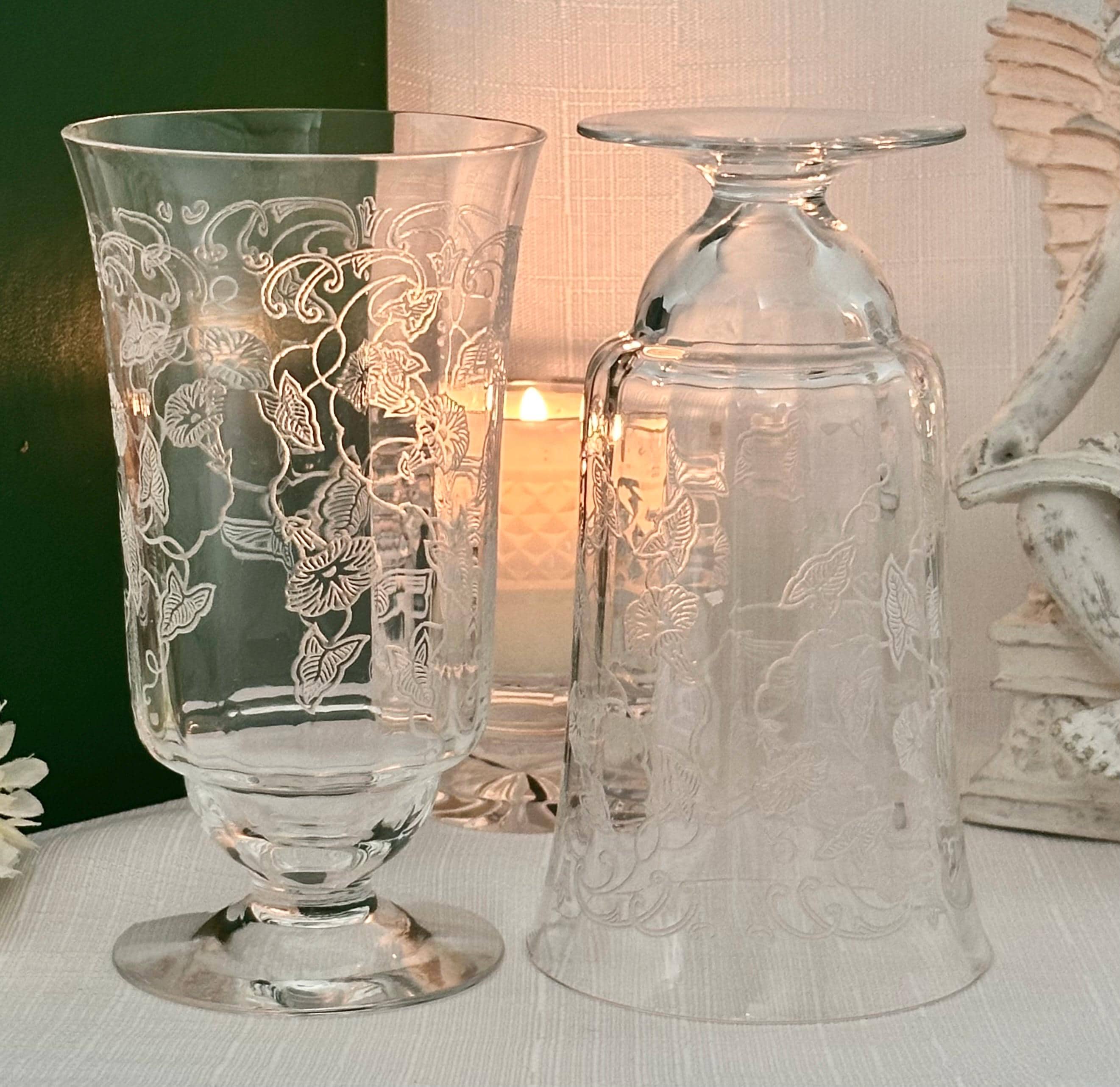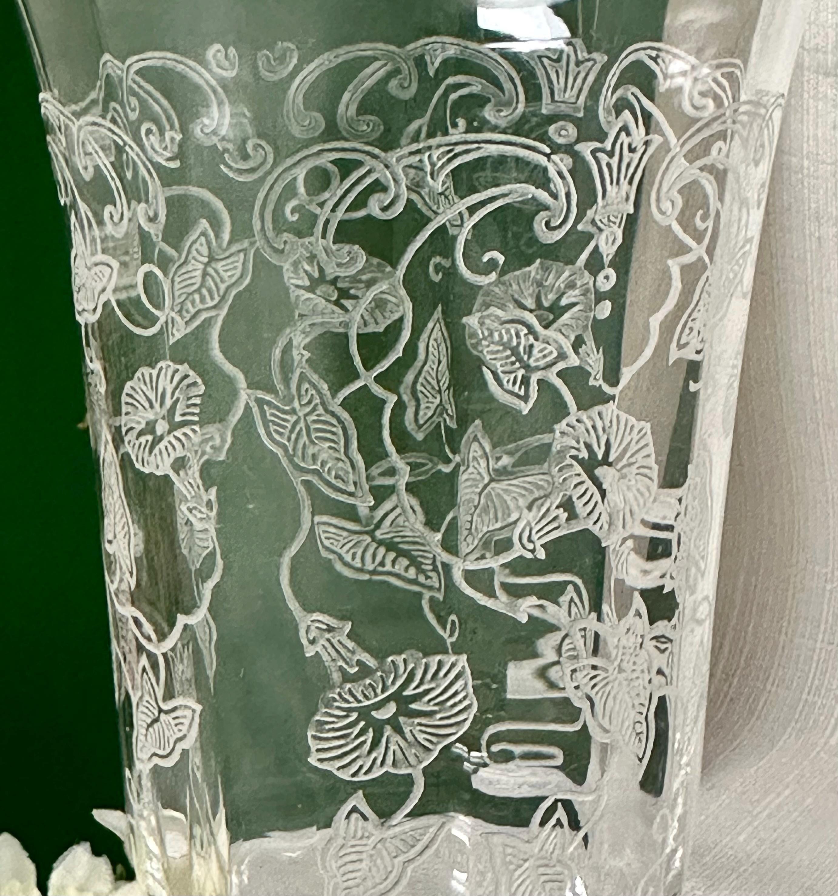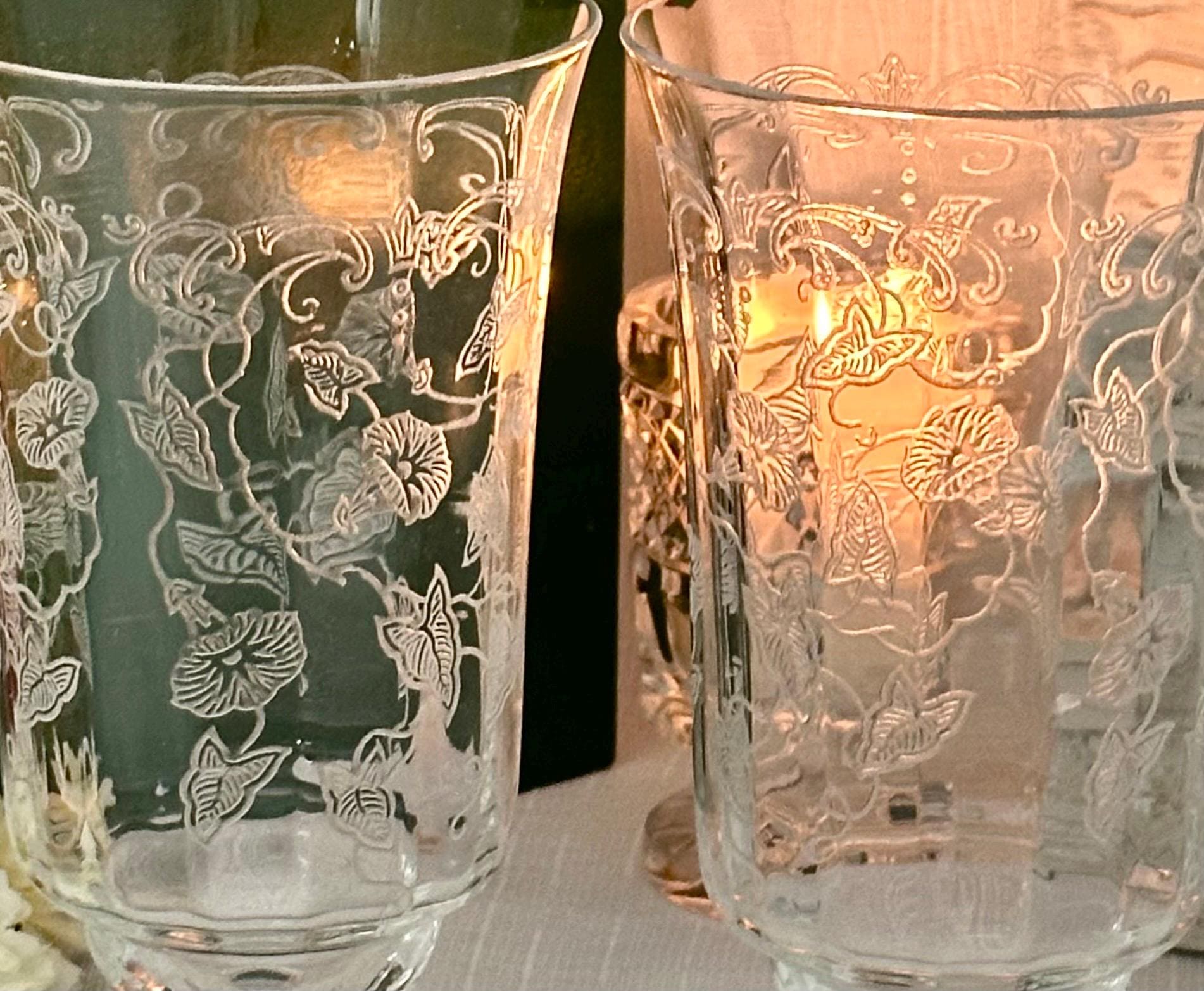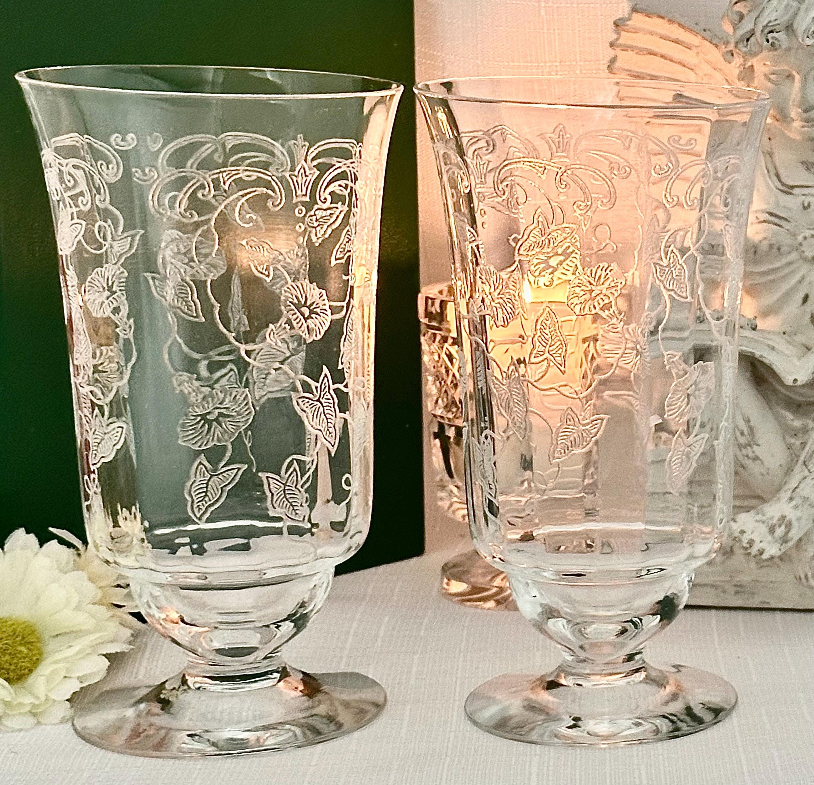 This is for a pair of Fostoria Morning Glory Ice Tea Glasses. These are a vintage pair of etched round drinking glasses perfect for all occasions. Made of clear glass, each glass features a floral design on the bowl with the etched pattern #313.